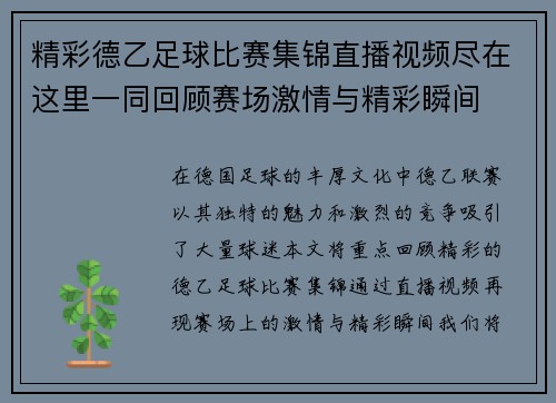 本文将对波鸿足球比赛的直播过程进行全程回顾,并对其中的精彩瞬间进行深入分析。通过剖析比赛的关键时刻、球员表现以及战术安排,旨在让读者更全面地理解这场比赛的意义与影响。从波鸿队的整体表现到个别球员的出色发挥,再到战术布置与调整,我们将从多个角度为大家呈现一个生动且详尽的波鸿足球比赛直播回顾。同时,文章...